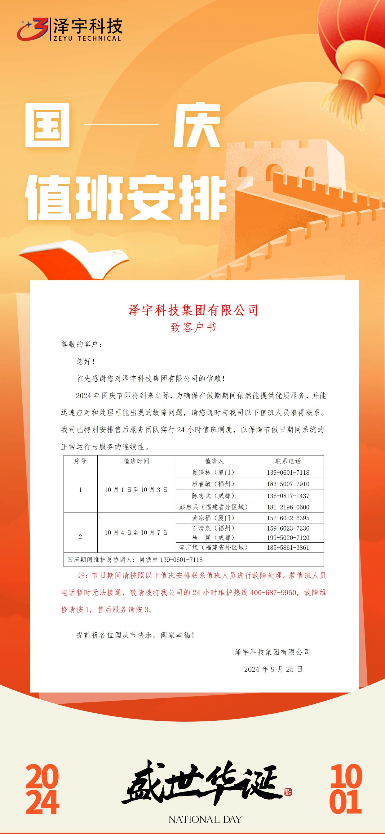 2024年國慶節(jié)即將到來之際,為確保在假期期間依然能提供優(yōu)質(zhì)服務(wù),并能迅速應(yīng)對和處理可能出現(xiàn)的故障問題,請您隨時與我司以下值班人員取得聯(lián)系。我司已特別安排售后服務(wù)團(tuán)隊實行24小時值班制度,以保障節(jié)假日期間系統(tǒng)的正常運行與服務(wù)的連續(xù)性。