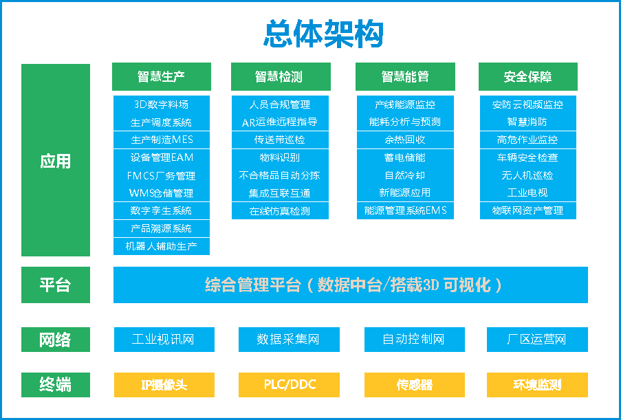 核心業(yè)務(wù):通過安全、人員、節(jié)能、資產(chǎn)、大數(shù)據(jù)看板等五個維度實智慧工廠的信息化基礎(chǔ)設(shè)施建設(shè),依托有線無線及5G通信的網(wǎng)絡(luò)傳輸,搭建智慧工廠可視化運營管理和智能化物聯(lián)應(yīng)用兩大體系,實現(xiàn)生產(chǎn)運營一體化、事務(wù)管理可視化、業(yè)務(wù)流程數(shù)字化,為智能制造提供助力,為企業(yè)數(shù)字化轉(zhuǎn)型賦能。