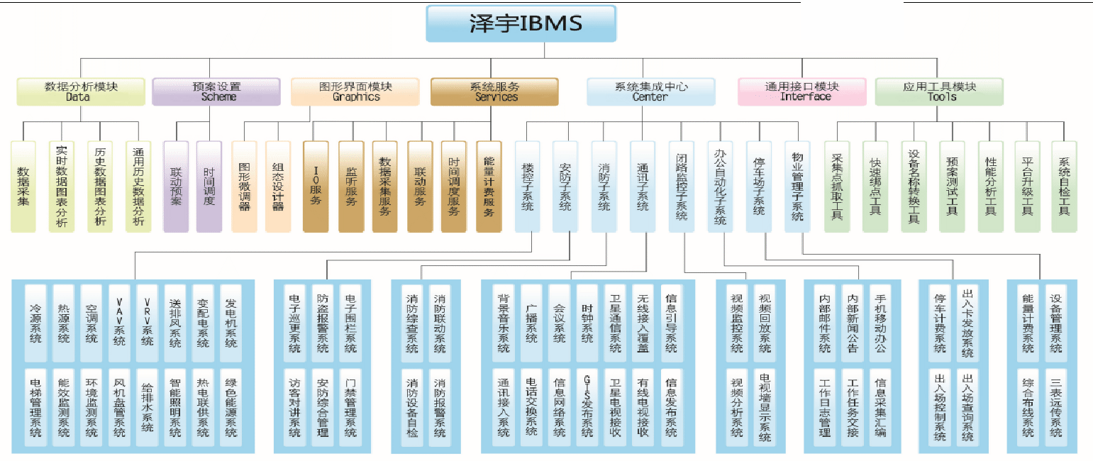 澤宇科技智能建筑管理系統(tǒng)(ZYIBMS),采用B/C/S架構(gòu),模塊化設(shè)計,E統(tǒng)一的軟件界面全面集成建筑內(nèi)樓宇自控、視頻監(jiān)控、防盜報警、消防報警、一卡通、智能照明、門禁管理系統(tǒng)、電子巡更、智能家居、能量計費系統(tǒng)、能源管理系統(tǒng)、酒店管理系統(tǒng)、停車場、電力、計算機網(wǎng)絡(luò)、辦公自動化、物業(yè)管理等子系統(tǒng)。實現(xiàn)圖形化集中管理、實時監(jiān)測、遠程控制、信息共享、時間調(diào)度、報表分析及跨子系統(tǒng)聯(lián)動等功能,真正實現(xiàn)整個建筑群體的自動化控制。