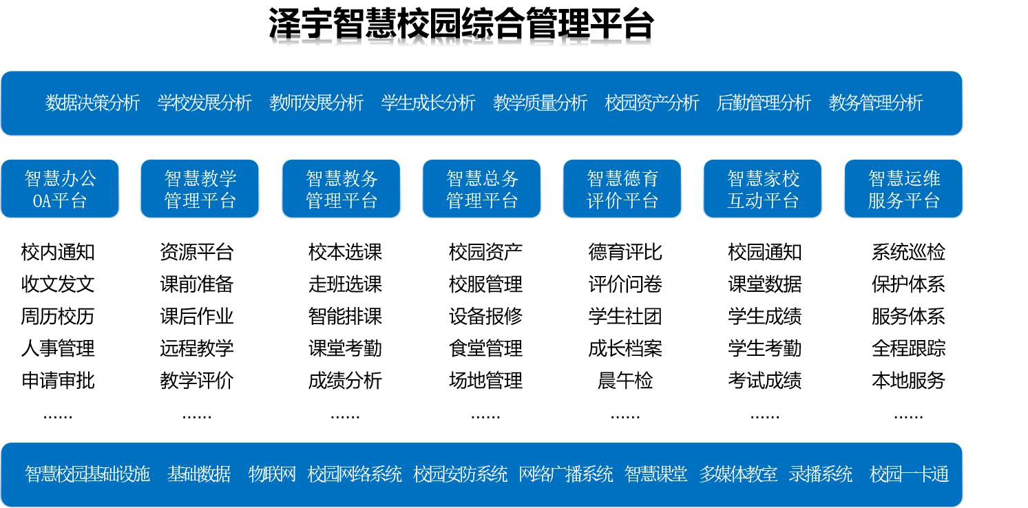 澤字智慧校園綜合管理平臺,以校園管理者、學生、教師為服務(wù)對象,將教學、管理、校園生活進行充分融合。統(tǒng)籌建設(shè)一體化智能化教學、管理與服務(wù)平臺。推進教育治理方式變革,加快形成現(xiàn)代化的教育管理與監(jiān)測體系,推進管理精準化和決策科學化。