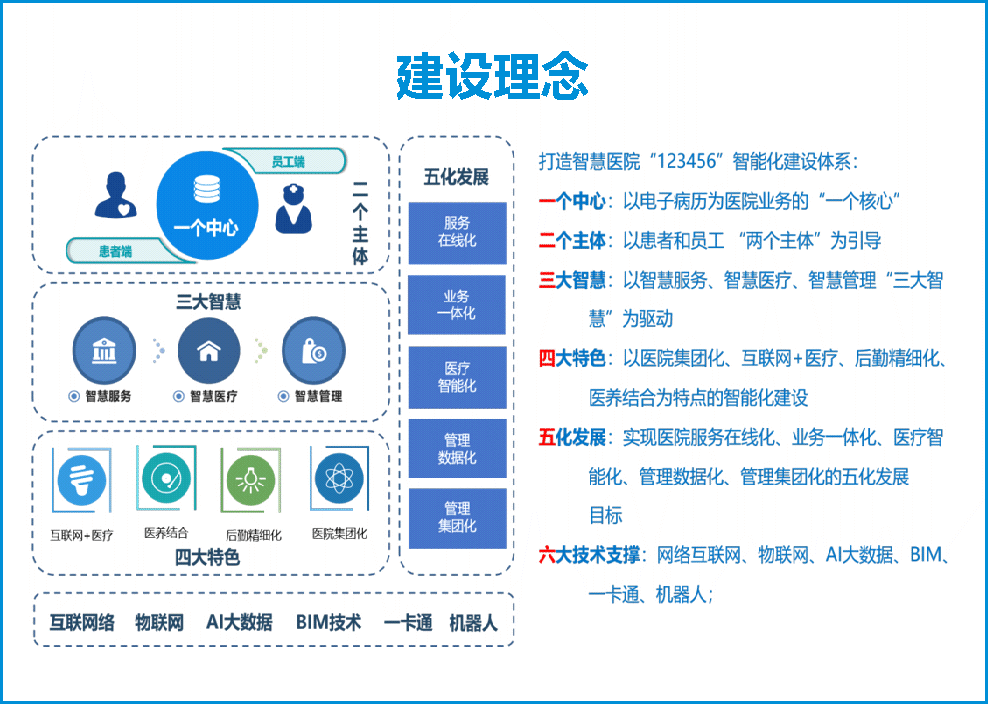智慧醫(yī)院是通過互聯(lián)網(wǎng)化技術(shù)實現(xiàn)移動應(yīng)用,為醫(yī)護人員及病人提供診前、診中、診后過程信息的輸入與輸出:同時構(gòu)建了醫(yī)院不同維度的數(shù)據(jù)系統(tǒng)及各維度數(shù)據(jù)的信息化集成應(yīng)用系統(tǒng);將大數(shù)據(jù)、云計算、物聯(lián)網(wǎng)技術(shù)、自動化設(shè)備、機器人、智能工作流與運營管理系統(tǒng)應(yīng)用于醫(yī)院運營管理,提高醫(yī)院的實現(xiàn)智慧型服務(wù)能力。最終實現(xiàn)病人、醫(yī)護人員、醫(yī)療機構(gòu)、醫(yī)療設(shè)備之間互聯(lián)互通,提高醫(yī)院運營水平,優(yōu)化診前、診中、診后診療服務(wù)過程的體驗。